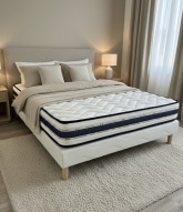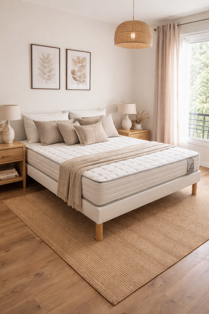 Composition: matelas en ressorts ensachés multizones + surmatelas Memory cousu et sommier tapissier en épicéa massif renforcé
